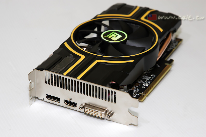 此外,這片顯示卡的散熱機制也非公板產品,它採用鋁質鰭片與熱導管做散熱主體,搭配9cm風扇,具有良好的散熱能力。顯示輸出則有DVI-I、HDMI與DisplayPort三種。
