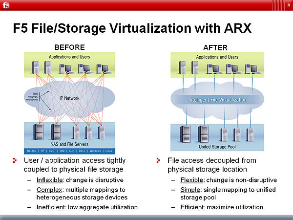 將所有儲存設備經由 ARX控管虛擬化之後,所有使用者所面對的儲存服務變成單一伺服器一般,也不用自己去搞懂自己或公司的資料究竟是存到那一台系統去。對企業而言,它可以將各種不同,甚至是異質的儲存系統(如SAN、NAS、iSCSI等)全部統合,不論新、舊的儲存系統,都能在虛擬化之下,得以再繼續使用,節省過往的投資,不會形成浪費。此外所有的儲存空間可以由中央控管,將容量做適當的調配,或是將不同的儲存設備再做階級式的使用,將設備的使用率提升至最高。